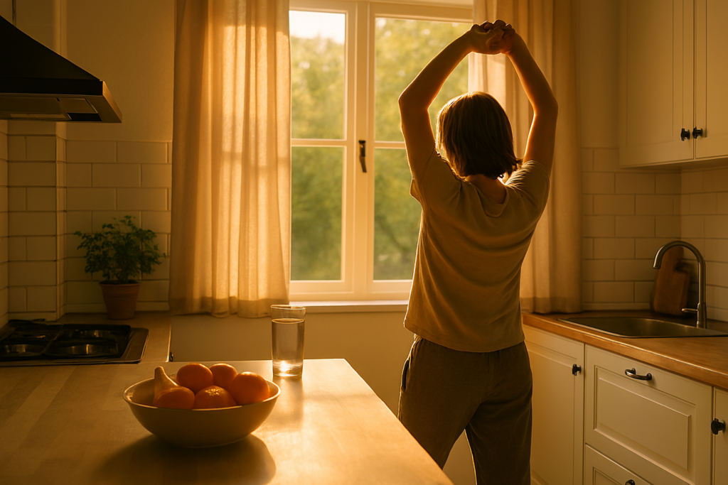 - Morning: light stretching or walk